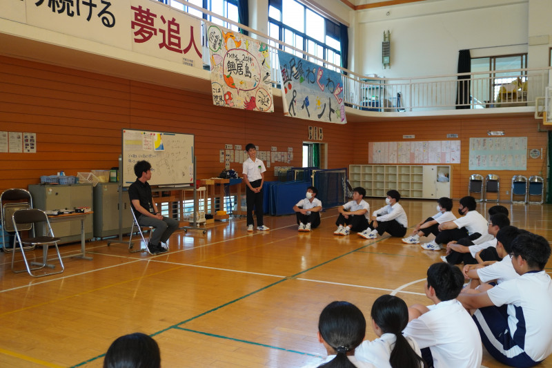 20人の生徒と先生方が来校され、歓迎会を行いました。興居島中学校は「水軍太鼓」を