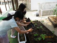 1年生は、6月から咲き始めたアサガオの花で染め物をしました。毎日咲き終わったアサガオを摘み取り、冷凍保存して貯めてきました。近所の山に咲いていた「リュウキュウアサガオ」を、たーくさん採ってくれてたおうちも!!たくさんのお花をモミモミして色を出します!「紫がきれーい!」と夢中でモミモミ!!(*^o^)